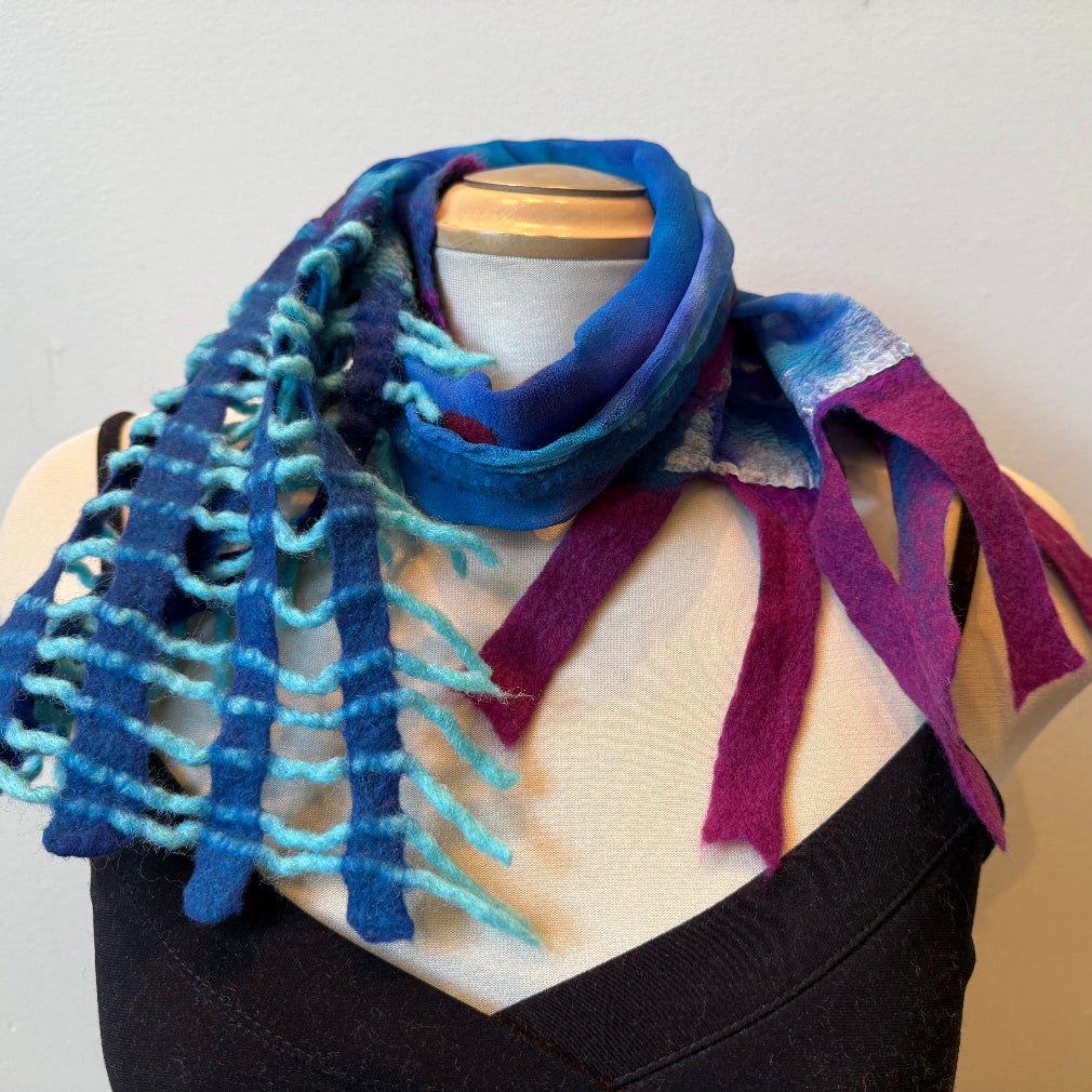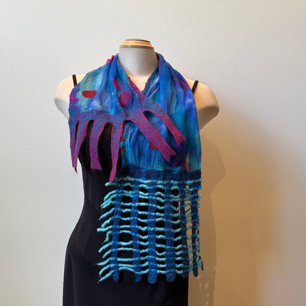 One of a kind, hand-painted and hand-felted blue and fuchsia art scarf. Art to wear. A hand felted pin is included for easy arrangement. Blues and fuchsias.