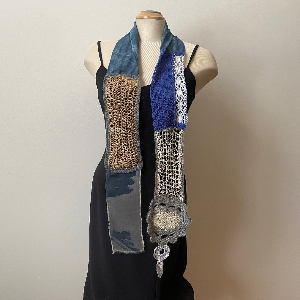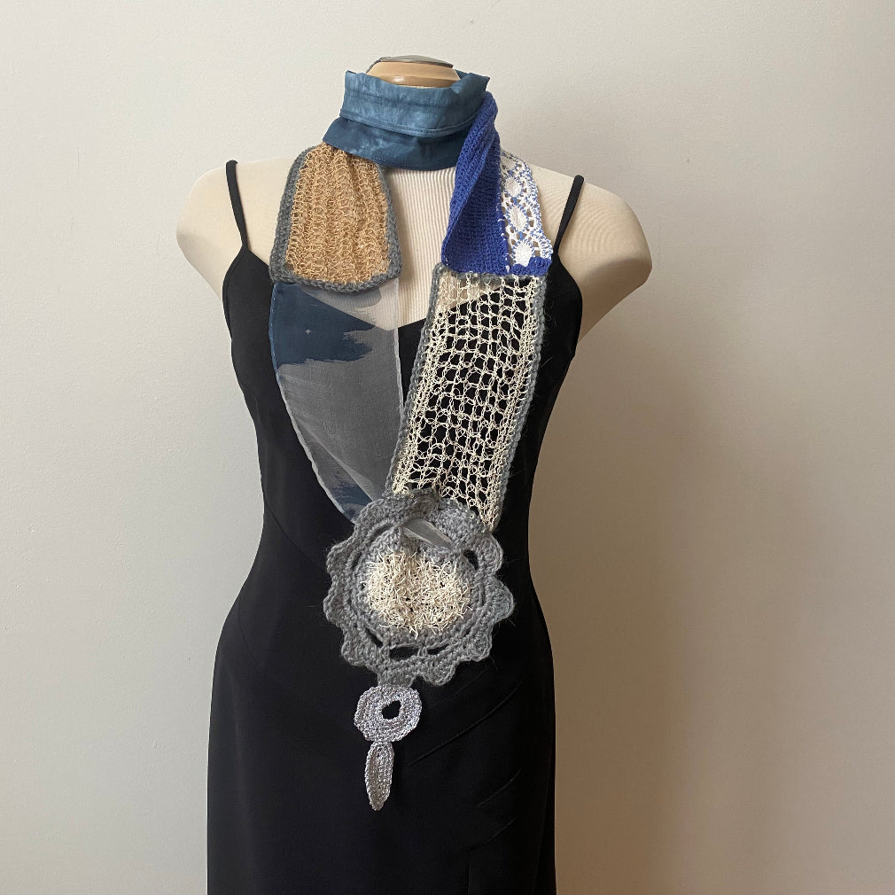 Hand crochet and hand painted art scarf, art to wear, grey taupe and blue designer scarf